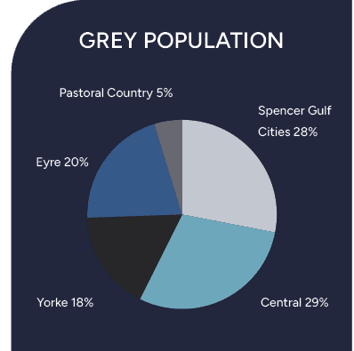 The electorate of Grey covers 908,595 sq km, 92.3% of South Australia; equivalent to 7 Englands. Within our electorate are the State electorates of Flinders, Giles, Stuart, Narungga, most of Frome and some of Chaffey and Light.